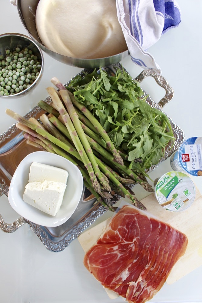 Endlich ist es soweit: Es gibt wieder Spargel! Ein Bund grüner Spargel, etwas Parmaschinken, eine Handvoll Rucola, knackige Erbsen, saftiger Schafkäse und frische Minze geben sich auf den knusprig gebackenen Flammkuchen ein frühlingshaftes Stelldichein.